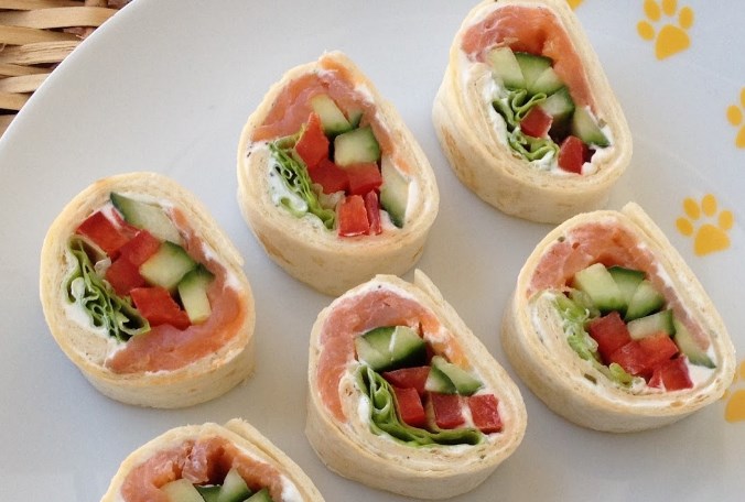 Rollitos de tortilla refrigerados, salmón y vegetales piezas pequeñas (8-9 piezas), enviar a un plato e inmediatamente Servir sobre la mesa.