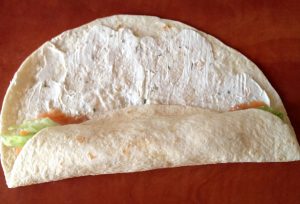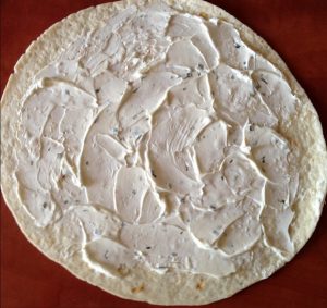 En un tazón, mezcle el requesón y el eneldo picado. Grasa Queso preparado con tortilla. Los pasteles de tortilla se pueden reemplazar con un pan de pita apretado
