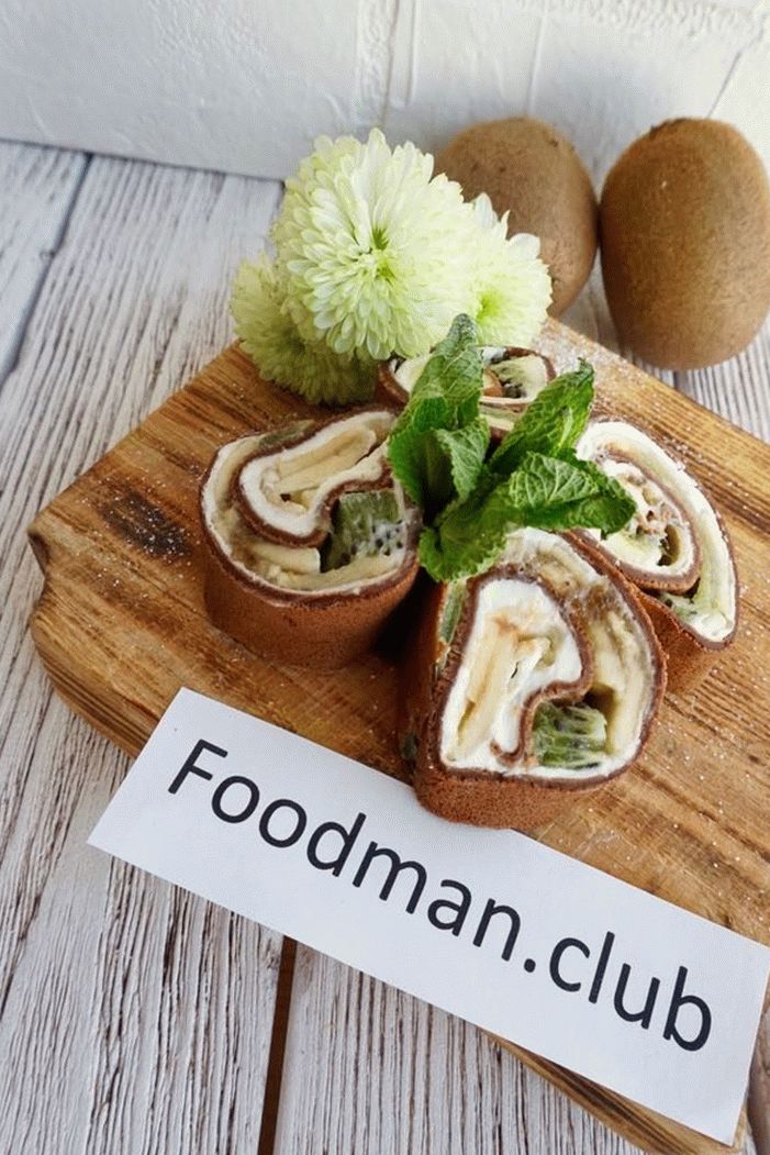 - Engrasa los panqueques enfriados con queso crema (o cuajada masa) Opcionalmente, agregue el azúcar en polvo a la masa de cuajada. al gusto Cortar la fruta en rodajas finas y colocar suavemente maldita sea Después de enrollar bien el panqueque en un rollo, envuélvalo en comida filmar y enviar al refrigerador por 30 minutos.