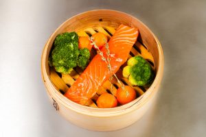 - Filete de salmón, sal y pimienta, espolvorear con jugo de limón. Filete poner en una caldera doble con brócoli y rodajas de zanahoria. Agregue nuez moscada y tomillo.