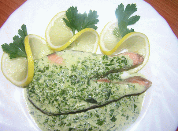 - Vierta el salmón con salsa espesa, adorne el plato con eneldo picado y limón