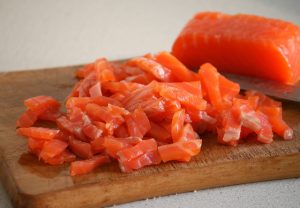 Pelar el salmón, lavar, separar la pulpa. Cortar el pescado en rebanadas en porciones.