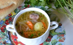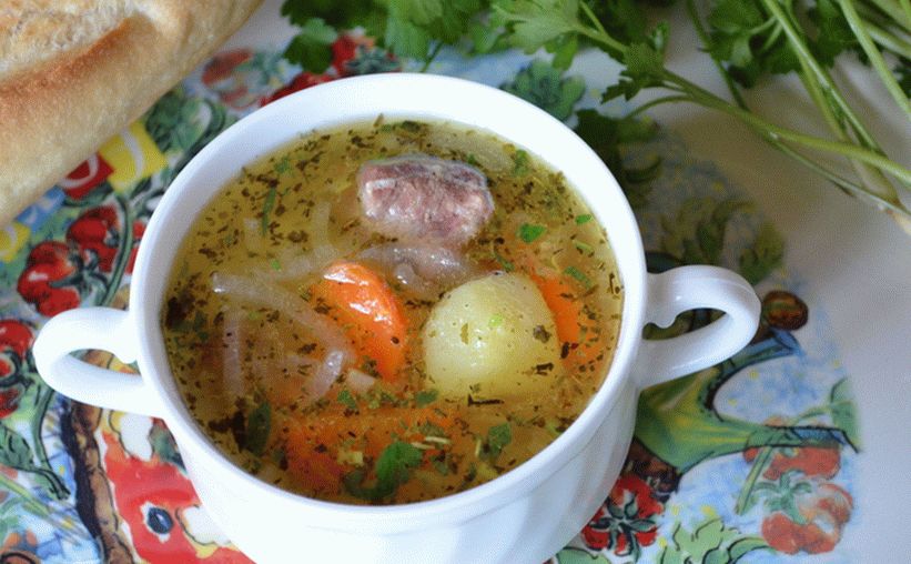 - Pelar las papas, zanahorias, cebollas, picar. Poner en el caldo Después de quitar las cebollas y las hojas de laurel, llevar a ebullición y cocine por otra media hora.