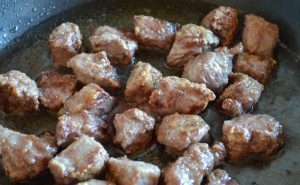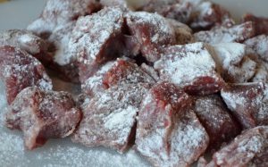 - Cortar el trozo de carne preparado en cubos, sal, pimienta, espolvorear con harina, mezclar.