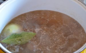 - Transfiera la carne a una sartén profunda, vierta dos litros de agua. Poner a fuego. Después de hervir agregar la cebolla entera, hoja de laurel, cocine una hora en un fuego silencioso.