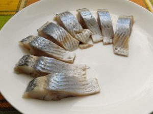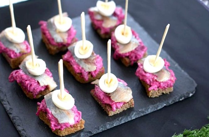 Aderezo de remolacha hervida con mayonesa de ajo. Rebanadas grandes cortar el pan de centeno en 4 partes, aplicar suavemente encima mezcla de remolacha y agregue un trozo de arenque. Palillos para perforar mitades de huevos de codorniz con el lado cortado y insertarlos en trozos de arenque.