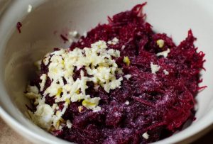 Remolacha preparada gruesa, agregue picada ajo y sal
