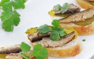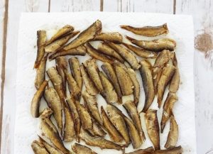 Sacamos pequeños espadines de la lata y, para eliminar el aceite, ponte toallas de papel.
