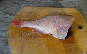 - Limpia la perca, corta el abdomen con un cuchillo y quita las entrañas, corta las aletas, cola.