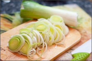- Cortar el puerro en aros, enjuagar con agua y secar.