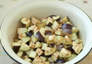 - Cortar la berenjena, espolvorear con sal, esperar 15 minutos, luego enjuague y seque con una servilleta.