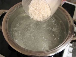 - Lleve a ebullición el caldo de pollo, ponga arroz y cocine 5 minutos