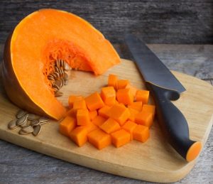 Mientras hierve, pela la calabaza y corta la pulpa en cubos. Añádelo al caldo, tira la cebolla entera y pica allí zanahorias en cubitos.