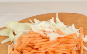 - Pica cebollas y zanahorias al azar.