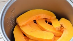 - Encienda el programa Steamer en la olla de cocción lenta (25 min.), Vierta agua y poner los trozos de calabaza.