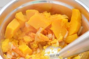 - Saltee la cebolla con zanahorias, extienda la calabaza y golpee una licuadora