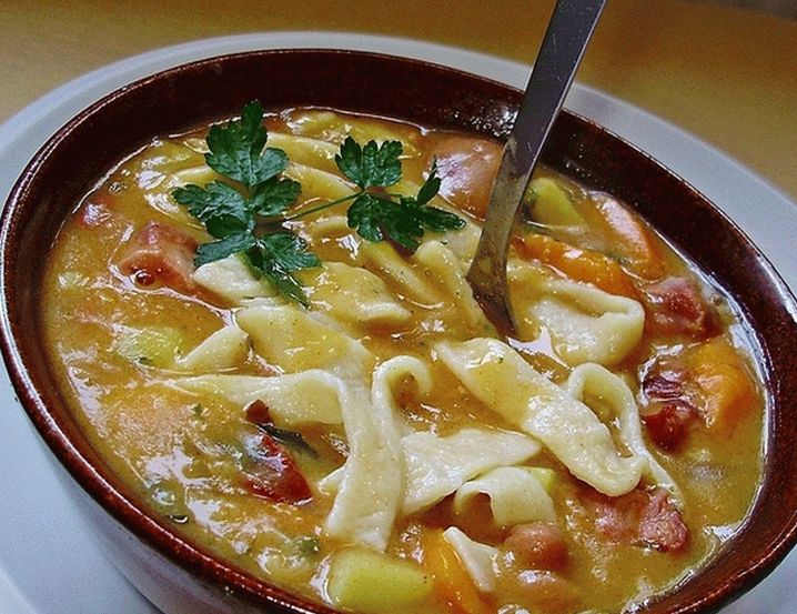- Agregue salchicha, calabacín, fideos, especias a la sartén. A la sal al gusto Hervir la sopa a fuego lento hasta que los ingredientes estén cocidos, revolviendo ocasionalmente.