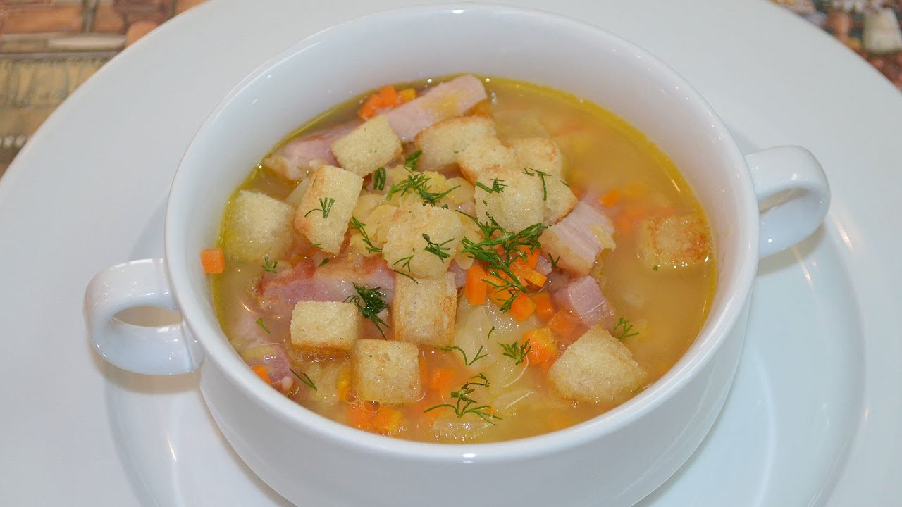 Deliciosamente aromática deliciosa sopa con carne, jamón y guisantes, cocinado en casa en una olla de cocción lenta, casi un clásico del soviet La cocina.