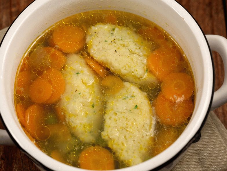 - Formamos albóndigas de la masa y las bajamos con una cuchara a la sopa. Cocine durante unos 10 minutos, y luego apague el fuego y deje reposar. 5-10 minutos