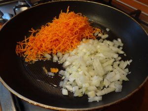 - Agregue aceite de girasol y fría la carne ahumada a la sartén. luego agregue cebolla, ajo, zanahorias, sal, pimienta y agregue especias Mezcle todo y cocine a fuego lento bajo una tapa cerrada. unos 10 minutos
