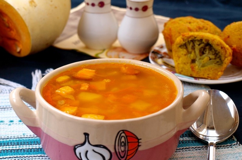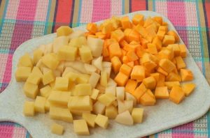 - Cortar las papas y la calabaza en rodajas idénticas. Extendido en sopa, cocine un cuarto de hora.
