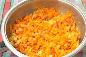 - Rallar las zanahorias con apio. Cortar la cebolla y la pechuga. Freír en una sartén en aceite, por orden de prioridad. Primero cebolla 3 min, luego pechuga 3 min, luego apio y zanahorias 5 minutos