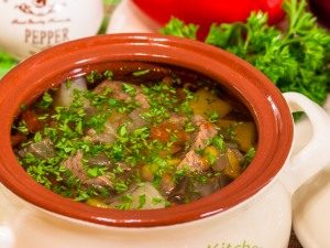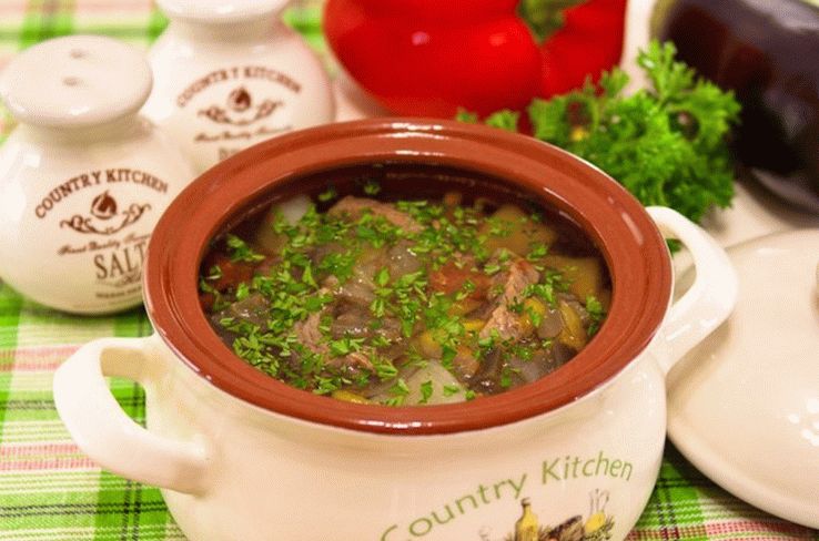 - Cerrar las macetas con tapas y poner en el horno durante una hora a temperatura de 180 grados. Servir la sopa terminada, espolvoreada hierbas picadas