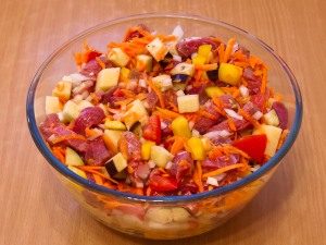 - En un tazón volumétrico, mezcle la carne picada, la cebolla, tomates, berenjenas, pimientos, papas y picados en medio rallador de zanahorias. Ligeramente sal y pimienta.