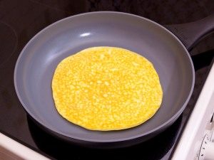 - Batir cada huevo, agregar un poco de sal. Freír panqueques con dos lados, luego cortar en pajitas.