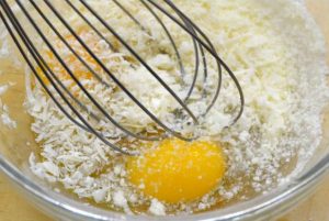 - En un tazón, mezcle los huevos con queso rallado, sazone con sal y batir con nuez moscada.