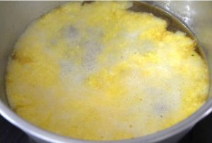 - Verter la mezcla en el caldo y batir durante varios minutos. mezclar hasta que la mezcla espese.