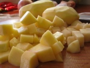 Pelar las papas, cortarlas en trozos grandes y ponerlas caldo