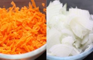 Picar un cuarto en aros, rallar las zanahorias a fuego medio rallador