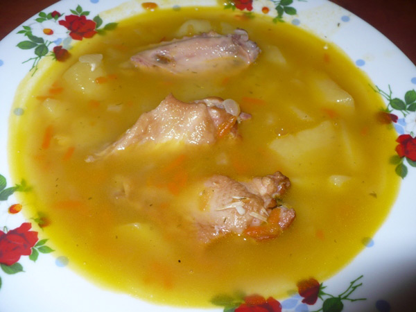 Sopa sabrosa y rica y nutritiva cocinada en casa desde muslos de pollo ahumado. Muy bueno si es hacer en la temporada de frío. Para reducir Sopa de calorías, necesita quitar la piel de las piernas.
