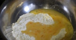 - Mezcle la leche con el huevo y la sal hasta que esté suave y vierta mezcla en harina.