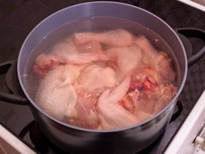 - Lave el pollo, córtelo en trozos, vierta frío agua, prender fuego, hervir, quitar espuma cuchara ranurada, cocine más a fuego medio hasta que esté cocido alrededor de una hora Luego retire los trozos de carne del caldo.