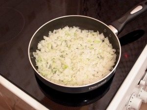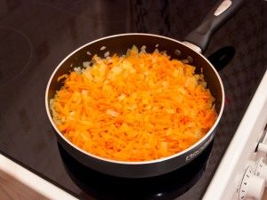 - Freír las cebollas picadas por separado, agregarle zanahorias, rallado en un rallador mediano. Freír juntos, revolviendo ocasionalmente.