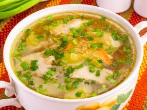 - Sopa lista para verter en papas, agregar hervida trozos de pollo espolvoreados con hierbas.