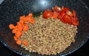 - Agregue un poco de aceite y ajo a la sartén, fría No por mucho tiempo. Luego tiramos tomates con zanahorias y agregamos lentejas.