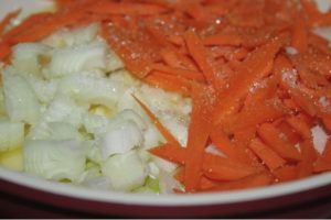 - Pasar las cebollas con zanahorias en aceite vegetal, espolvoreadas azúcar