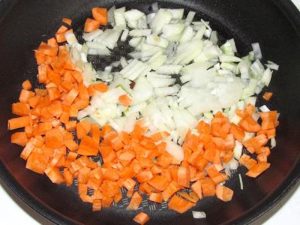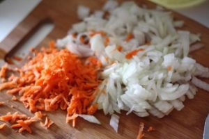- Durante este tiempo, ralla las zanahorias en un rallador fino, pica la cebolla cubo pequeño