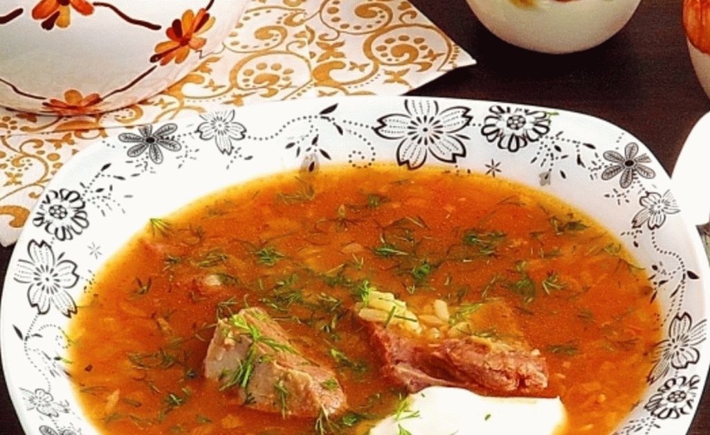 Carne tierna de ternera en huesos de leche con picante y picante la sopa de tomate y el arroz harán esta sopa según las recetas rumanas cocina con un delicioso primer plato en tu mesa.