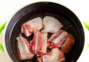 - Picamos y lavamos las costillas. Agua de la bahía, hervir costillas alrededor de 2 horas El fuego debe estar tranquilo, hirviendo casi invisible. No olvide quitar la espuma primero.