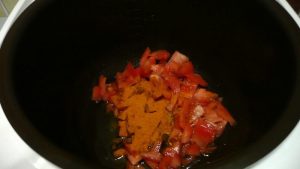 - Active el modo multicocina “Fritura” (10 min). Pasar tomate con cúrcuma en aceite. Unte el tomate y agréguelo a Fin de la cocción.