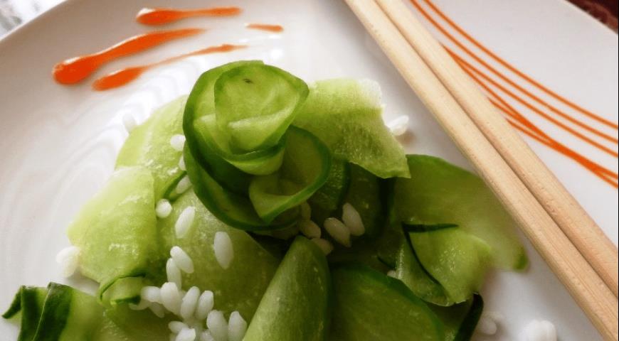 Para todos los amantes del crujido, les propongo cocinar esta casa sin pretensiones sabroso sunomono con arroz. Ensalada refrescante de aperitivo con Los pepinos se pueden hacer para reuniones con amigos.