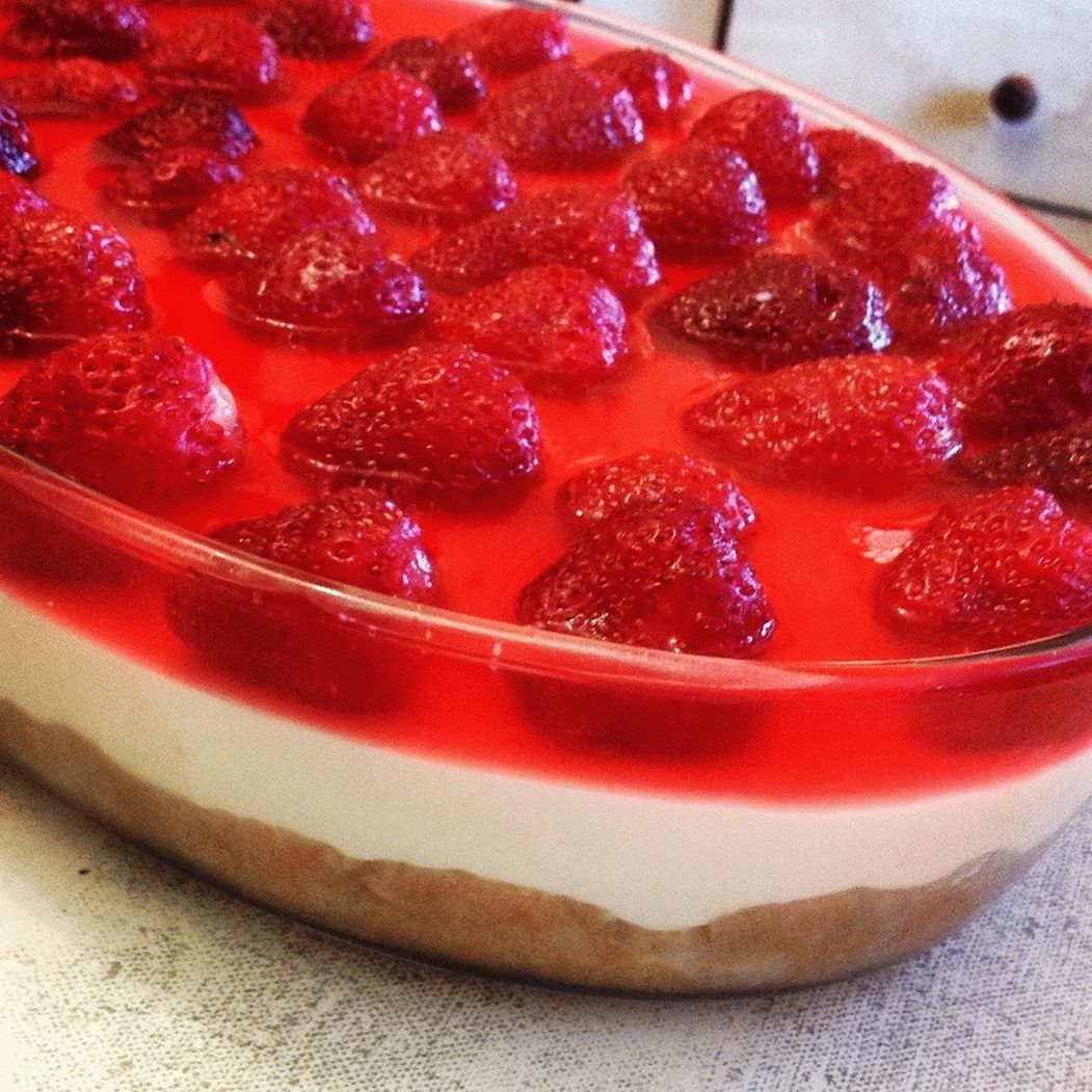 Retire con cuidado la tarta de queso del recipiente por los bordes de la película. Postre listo