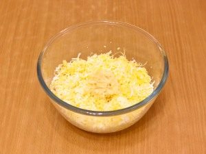 - En un tazón, mezcle el queso rallado, los huevos, agregue el ajo, Pasó por una prensa, ligeramente sal, mezcla.