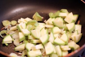 - Calabacín cortado en rodajas finas y agregar a la sartén.