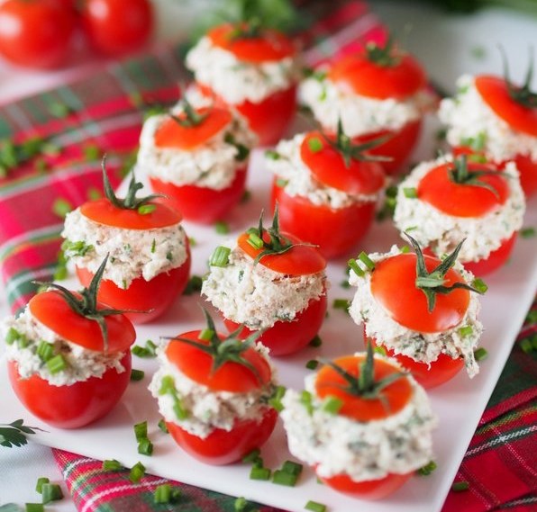 Rellene los tomates cherry huecos con la mezcla de pescado preparada, enviar a un plato, espolvorear con cebolla verde picada y cerrar tapas con esquejes. Un hermoso aperitivo frío se sirve de inmediato. Mesa de vacaciones.
