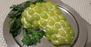 Muy elegante y hermosa ensalada de hojaldre en forma de racimo de uvas decorará cualquier mesa festiva. Lo más destacado se le da al plato por la combinación curry y nuez con uvas dulces.